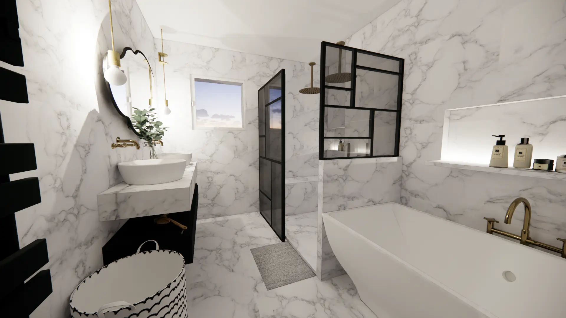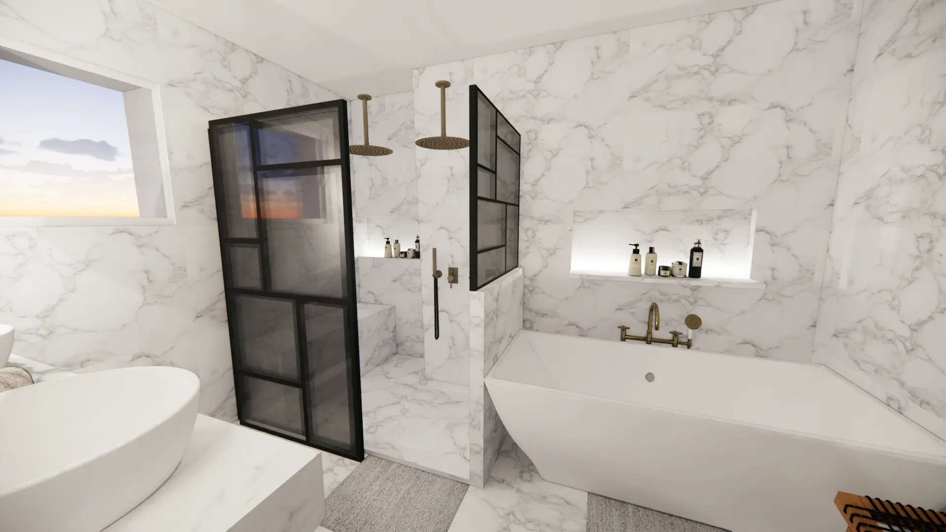 Une salle de bain entièrement habillée de marbre, du sol aux murs.Objectif : offrir une pièce élégante et raffinée, avec baignoire pour les enfants et douche spacieuse pour les parents.