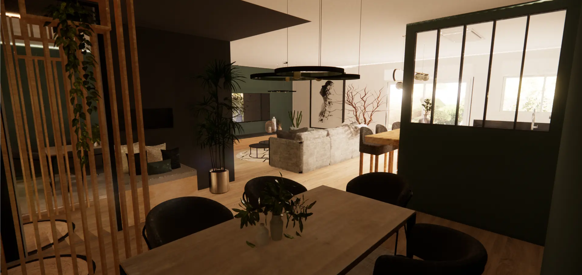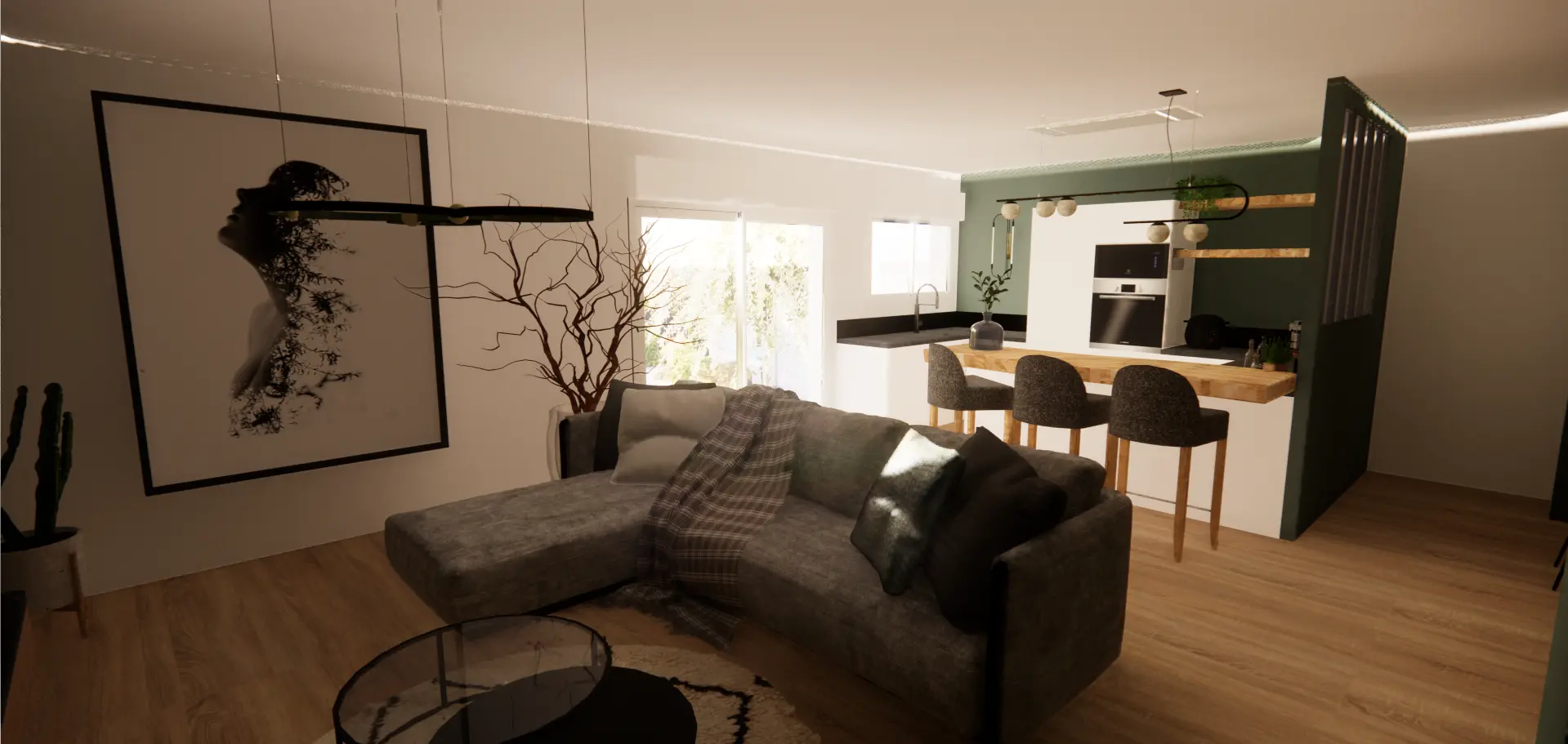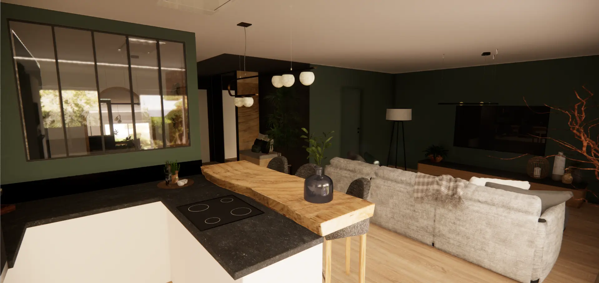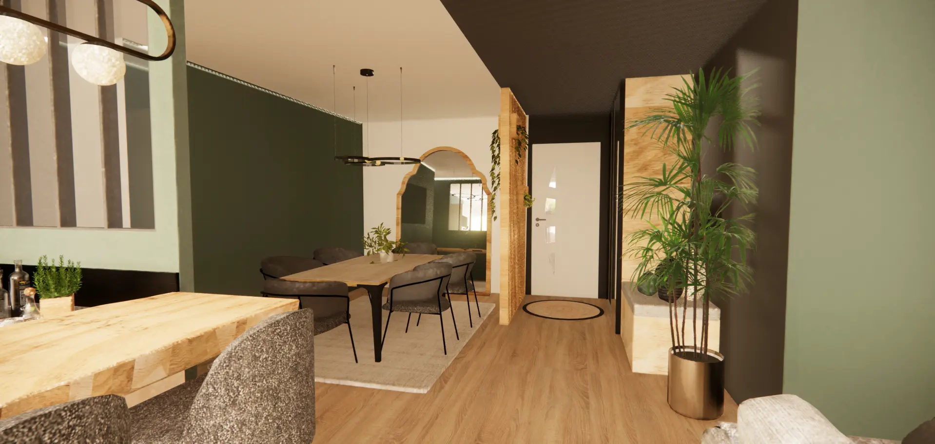 Une maison principale réinventée pour un jeune couple indécis. Bois naturel, vert sapin et touches modernes composent un intérieur accueillant, chaleureux et plein de caractère.