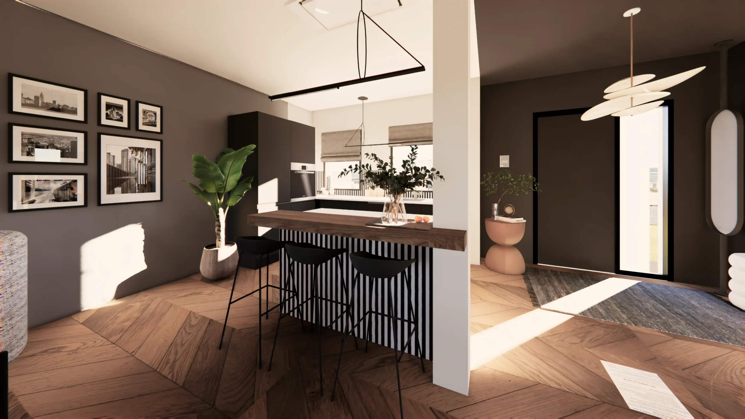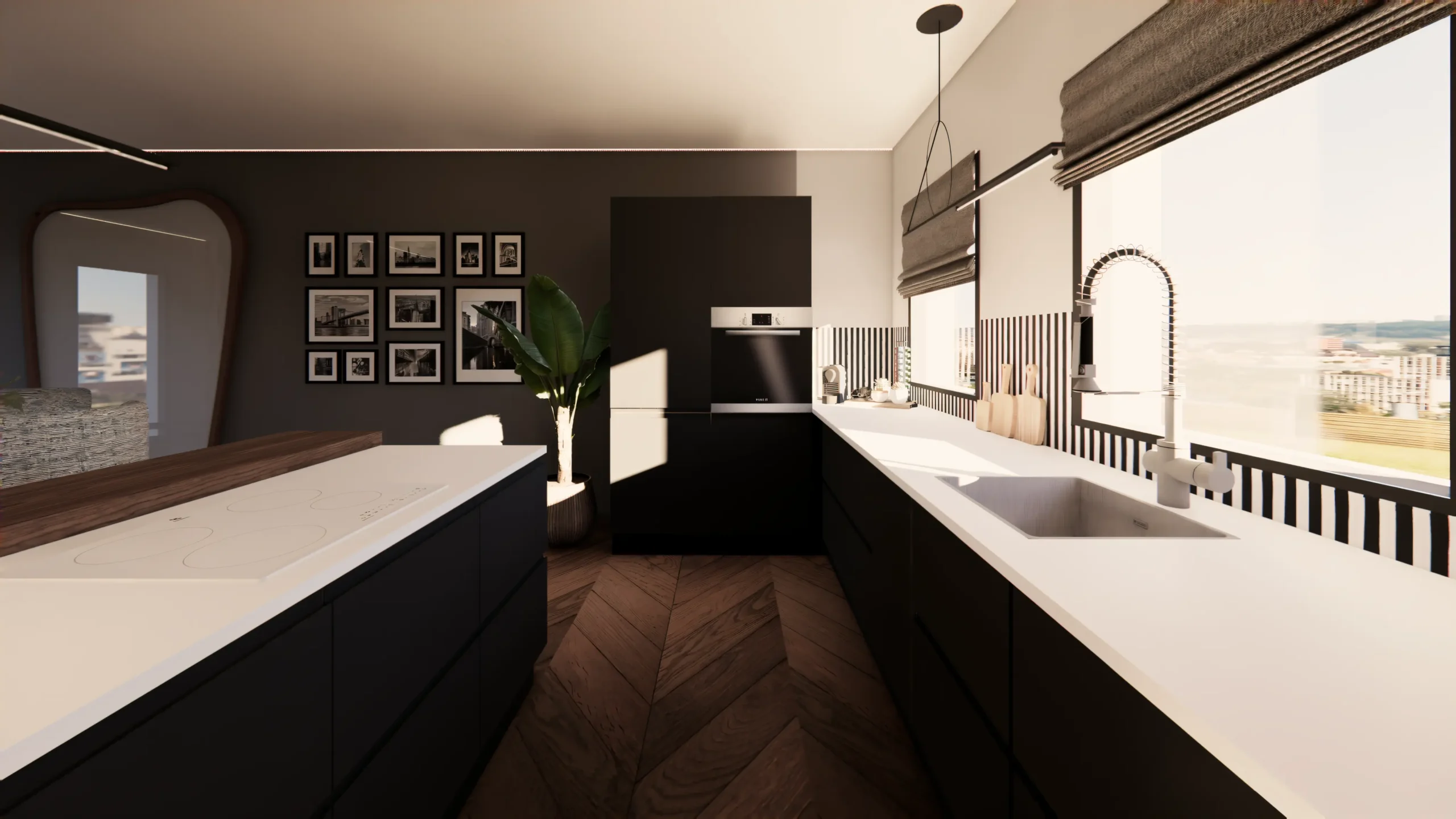 Silence Chromatique est une cuisine à la composition achromatique, pensée autour d’un contraste graphique noir et blanc. Le bois sombre réchauffe l’ensemble, tandis que les lignes épurées et l’agencement minimaliste créent une atmosphère élégante, sobre et contemporaine.